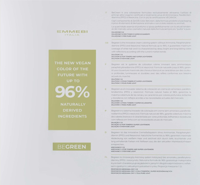 Das Ergebnis: eine perfekte Abdeckung des grauen Haares und eine Farbe mit einem intensiven, brillanten, natürlichen und lang anhaltenden Glanz. ZER035 COLOR BeGreen LEISTUNG: 100%ige Abdeckung von grauem Haar Perfekte Abdeckung sogar auf Stufe 9 Aufhellung bis zu 3 Stufen Länger anhaltende Farbe Brillantes und leuchtendes Ergebnis Weiche und cremige Textur Leicht zu mischen und aufzutragen Absoluter Respekt für Haut und Haar Extreme Flüssigkeitszufuhr während des Dienstes Zarte und lang anhaltende Reflexion ZER035 COLOR BeGreen enthält keine "potenziell reizenden" Inhaltsstoffe, die für die meisten unerwünschten Reaktionen verantwortlich sind, und ist besonders für empfindliche Haut geeignet.